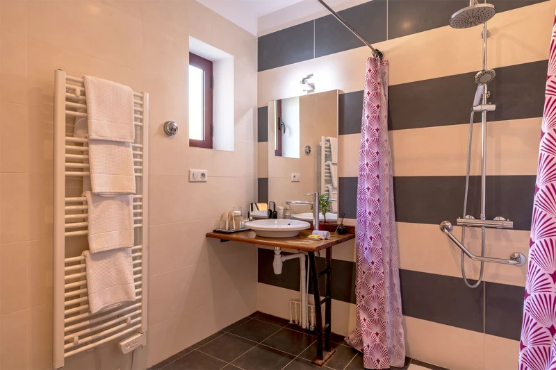 Une salle d’eau avec douche à l'italienne (chauffe eau solaire), vasque, toilette rehaussée, sèche-serviettes et sèche-cheveux.