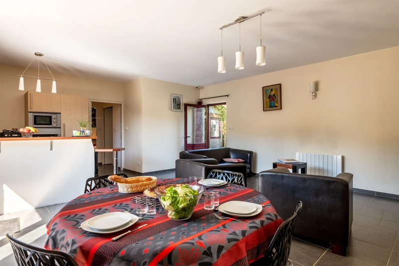 Un espace repas avec table et chaises (nappe fournie).