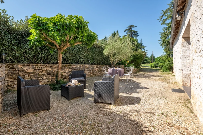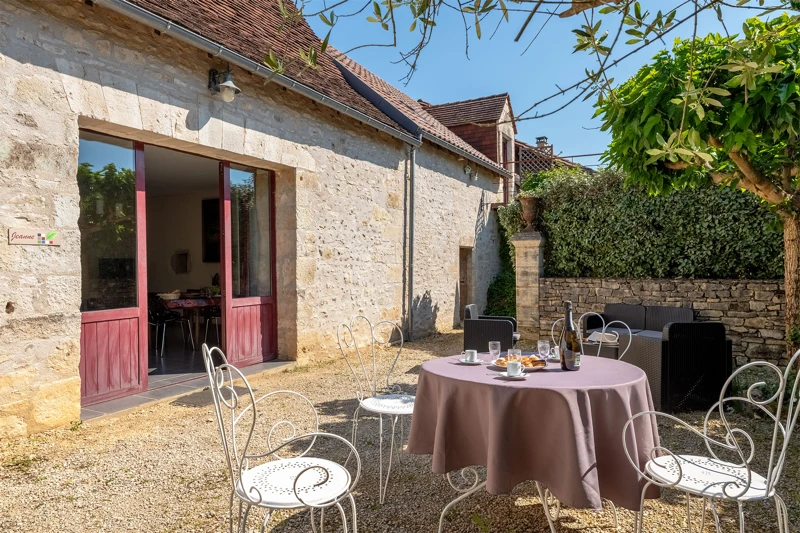 La terrasse de Jeanne est une petite cour, ombragée et protégée par une haie de éleagnus. Dès que les beaux jours reviennent, c'est l'occasion de profiter du salon de jardin et de déjeuner en extérieur.