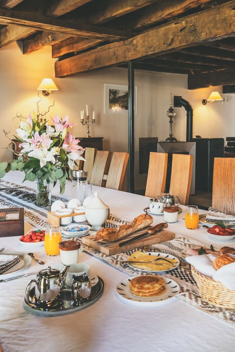Il est composé de : boissons chaudes (thé, café, chocolat), jus de fruit, pain, viennoiseries, beurre, confitures et yaourts maison, oeufs (sur demande), jambon & fromage, salade de fruits de saison.